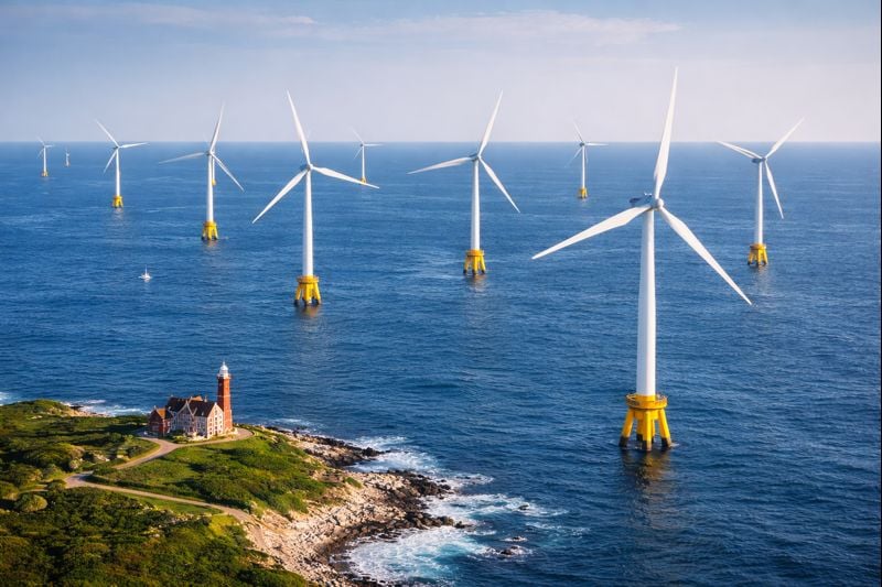 Ảnh minh họa một trang trại điện gió ngoài khơi đảo Brock, bang Rhode Island, với những tua bin gió cao vút trên mặt nước.