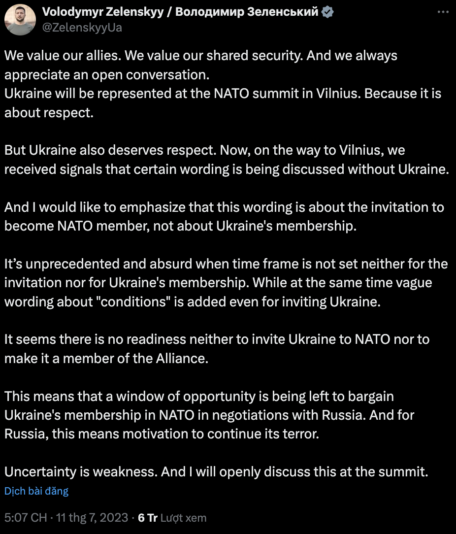 Màn kịch đạt đỉnh tại hội nghị thượng đỉnh Vilnius vào tháng 7/2023, khi các lãnh đạo NATO không đưa ra lời mời hay xác định con đường phía trước, phơi bày khoảng cách giữa lời nói và thực tế.