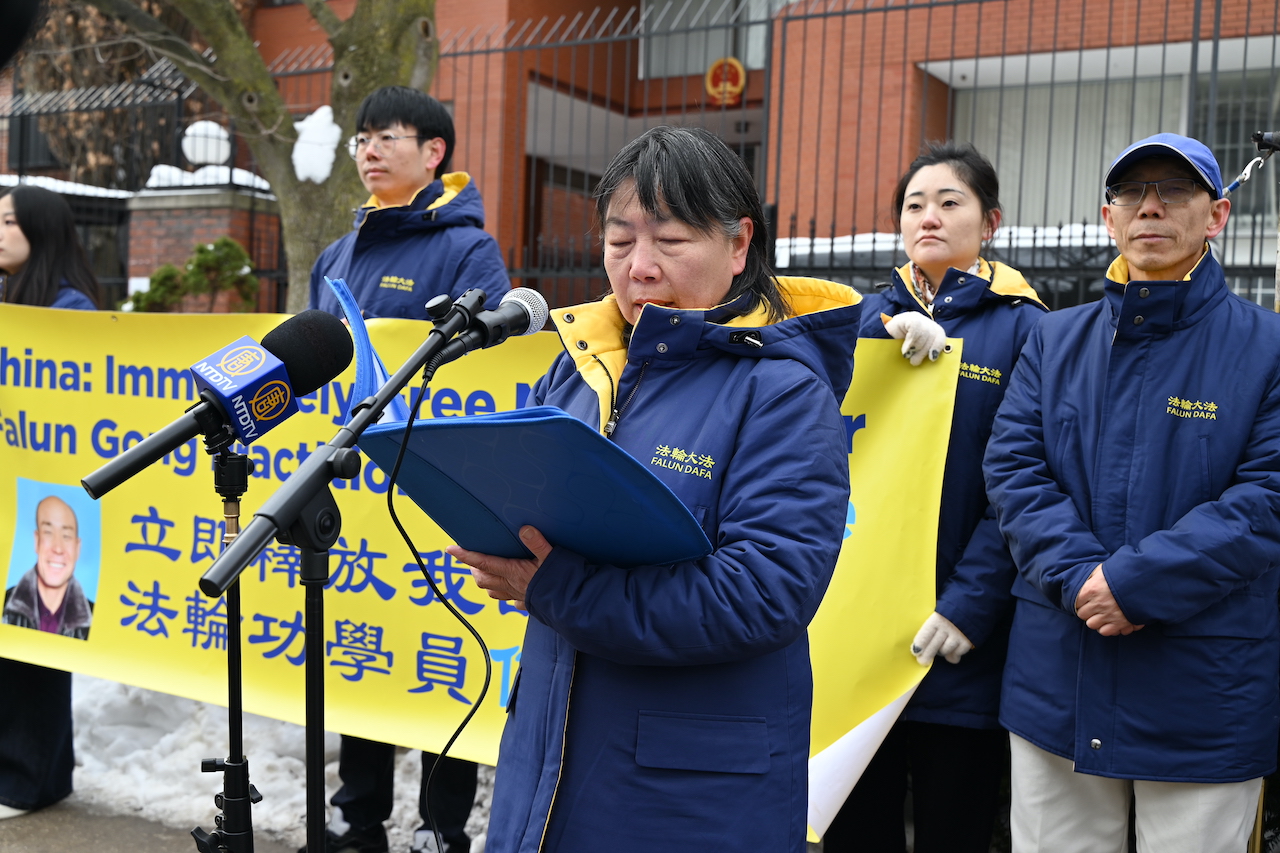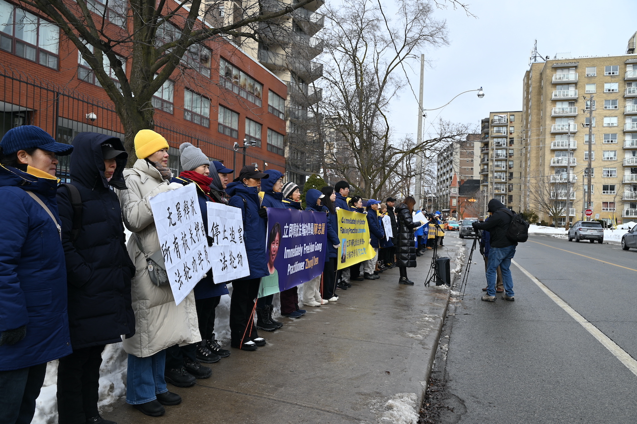 Ngày 12/2, một số người tập Pháp Luân Công tại Toronto đã tập trung trước Lãnh sự quán Trung Quốc, phản đối Đảng Cộng sản Trung Quốc (ĐCSTQ) bức hại Pháp Luân Công, đồng thời kêu gọi Chính phủ Canada phối hợp với cộng đồng quốc tế gây sức ép với chính quyền ĐCSTQ, chấm dứt cuộc bức hại và ngay lập tức trả tự do cho tất cả người tập Pháp Luân Công đang bị giam giữ, bao gồm 5 thân nhân và bạn bè của những người tập Pháp Luân Công tại Canada.