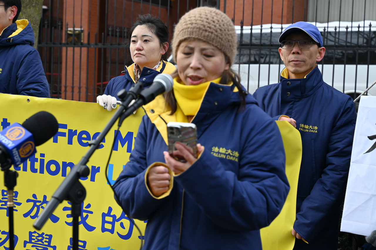 Ngày 12/2/2026, một người tập Pháp Luân Công tại Toronto đã tập trung trước Lãnh sự quán ĐCSTQ, phản đối ĐCSTQ bức hại Pháp Luân Công, kêu gọi chính phủ Canada cùng cộng đồng quốc tế chấm dứt bức hại, yêu cầu ĐCSTQ trả tự do cho tất cả học viên Pháp Luân Công đang bị giam giữ. (Ảnh: Y Linh / Epoch Times)