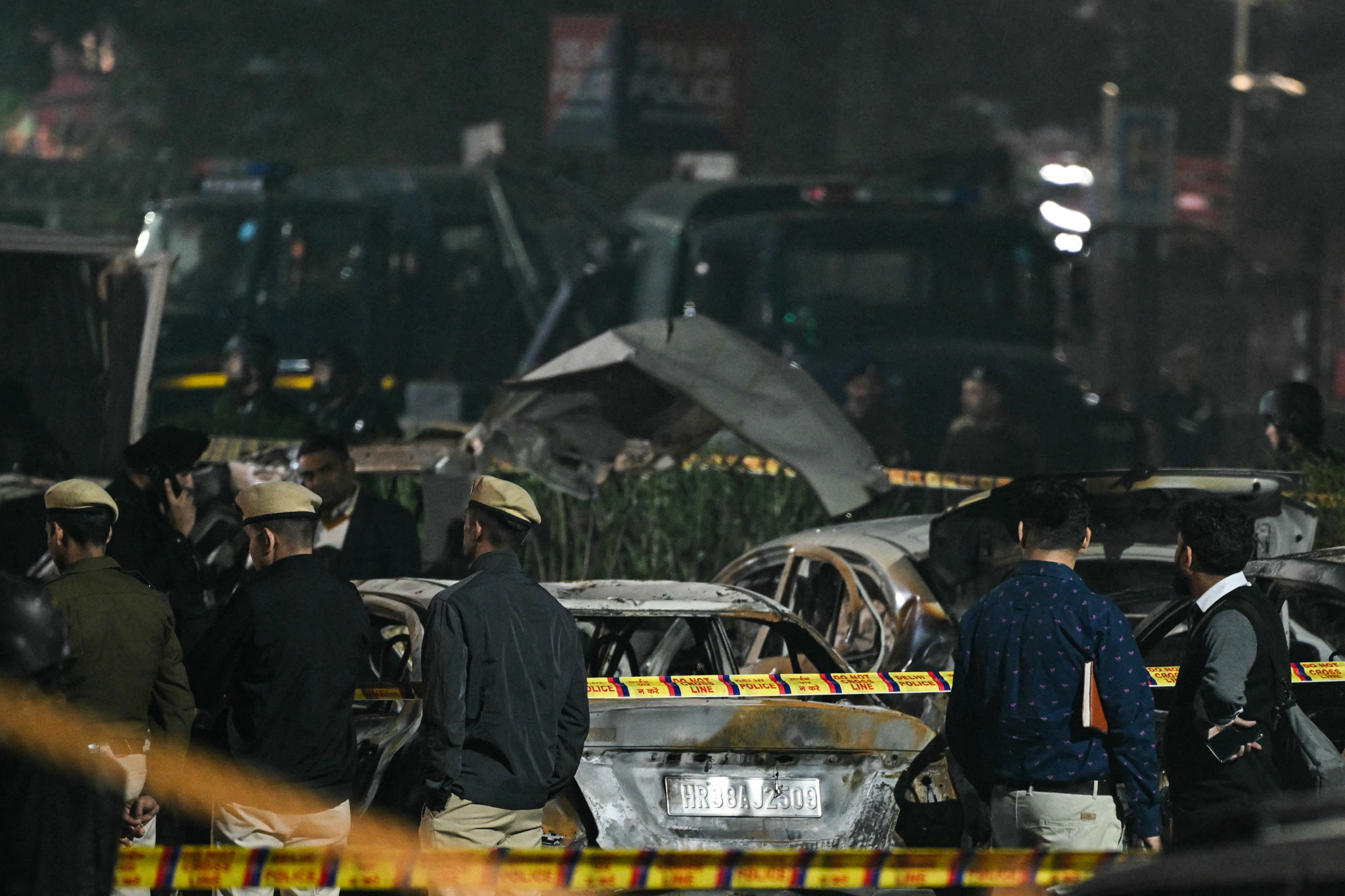 Vào ngày 10 tháng 11 năm 2025, một quả bom xe đã phát nổ gần Pháo đài Đỏ ở Phố Cổ Delhi. Lực lượng an ninh đứng cạnh chiếc xe bị cháy rụi tại hiện trường vụ nổ. (Photo by SAJJAD HUSSAIN/AFP via Getty Images)