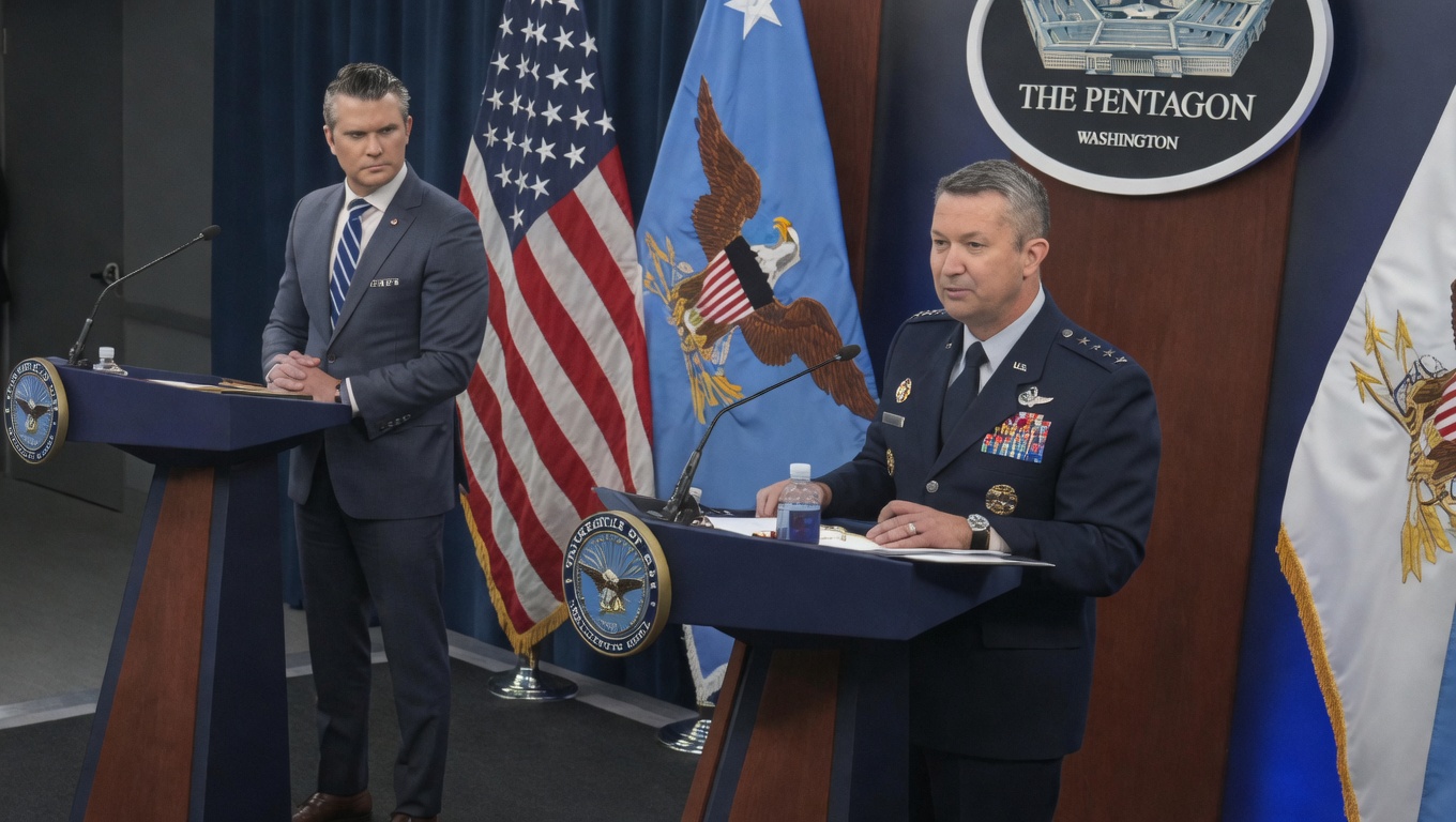 Hôm 16/4, Bộ trưởng Chiến tranh Mỹ Pete Hegseth và Chủ tịch Hội đồng Tham mưu trưởng Liên quân, Tướng Dan Caine, cùng họp báo tại Lầu Năm Góc. (Ảnh chụp màn hình video)