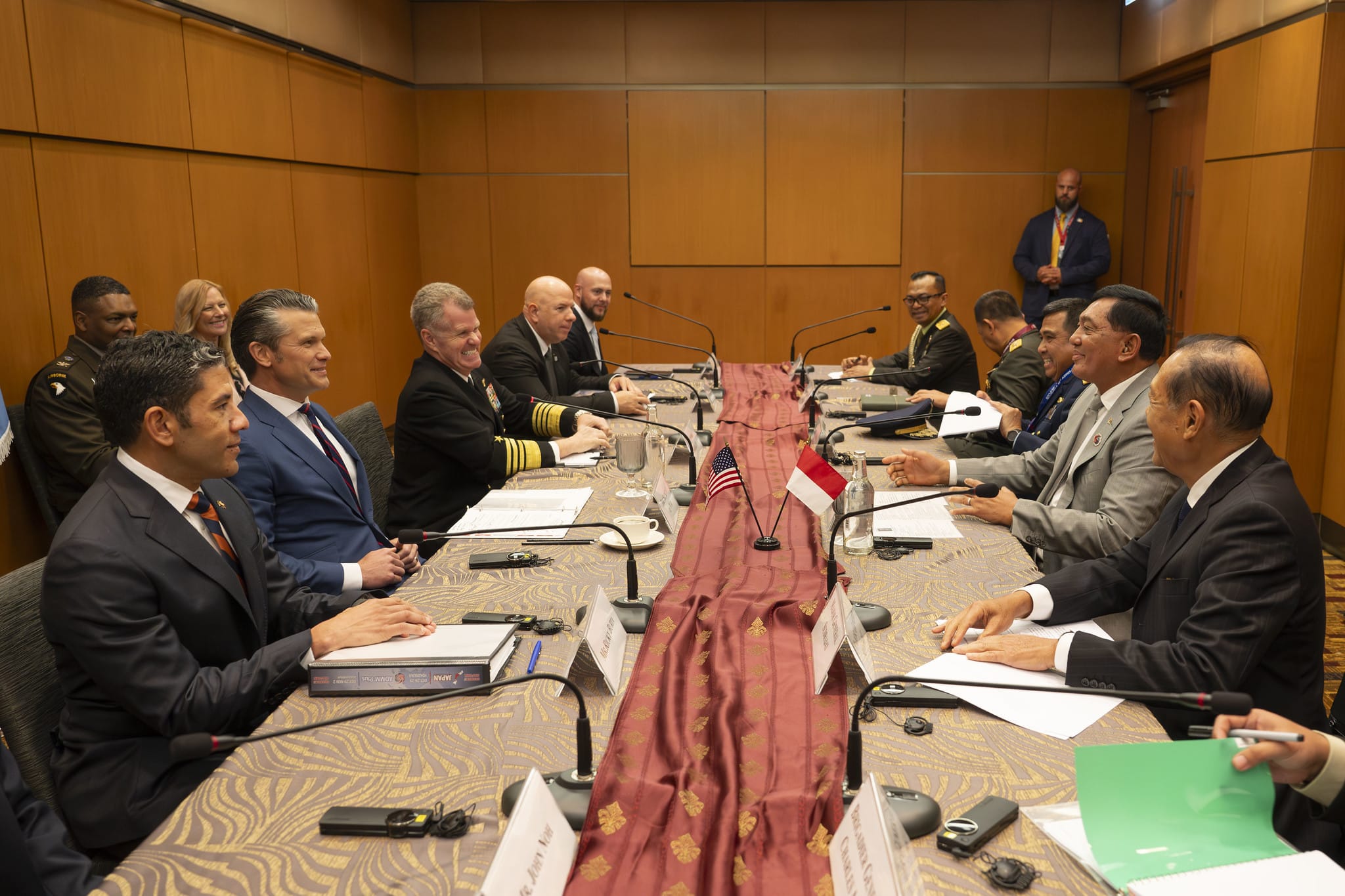Bộ trưởng Chiến tranh Pete Hegseth tiếp đón Bộ trưởng Quốc phòng Indonesia Sjafrie Sjamsoeddin trong buổi trao đổi song phương tại Kuala Lumpur, Malaysia, ngày 31 tháng 10 năm 2025. (Ảnh Bộ Chiến tranh do Trung sĩ Không quân Mỹ Madelyn Keech chụp)