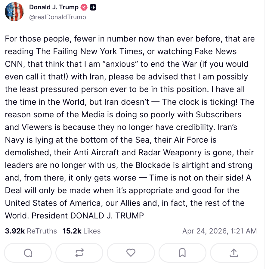 “Đối với những người — hiện nay ngày càng ít — vẫn đọc tờ The New York Times ‘thất bại’ hoặc xem CNN ‘tin giả’, và cho rằng tôi đang ‘nóng lòng’ kết thúc cuộc chiến (nếu còn có thể gọi là chiến tranh!) với Iran, thì xin lưu ý: