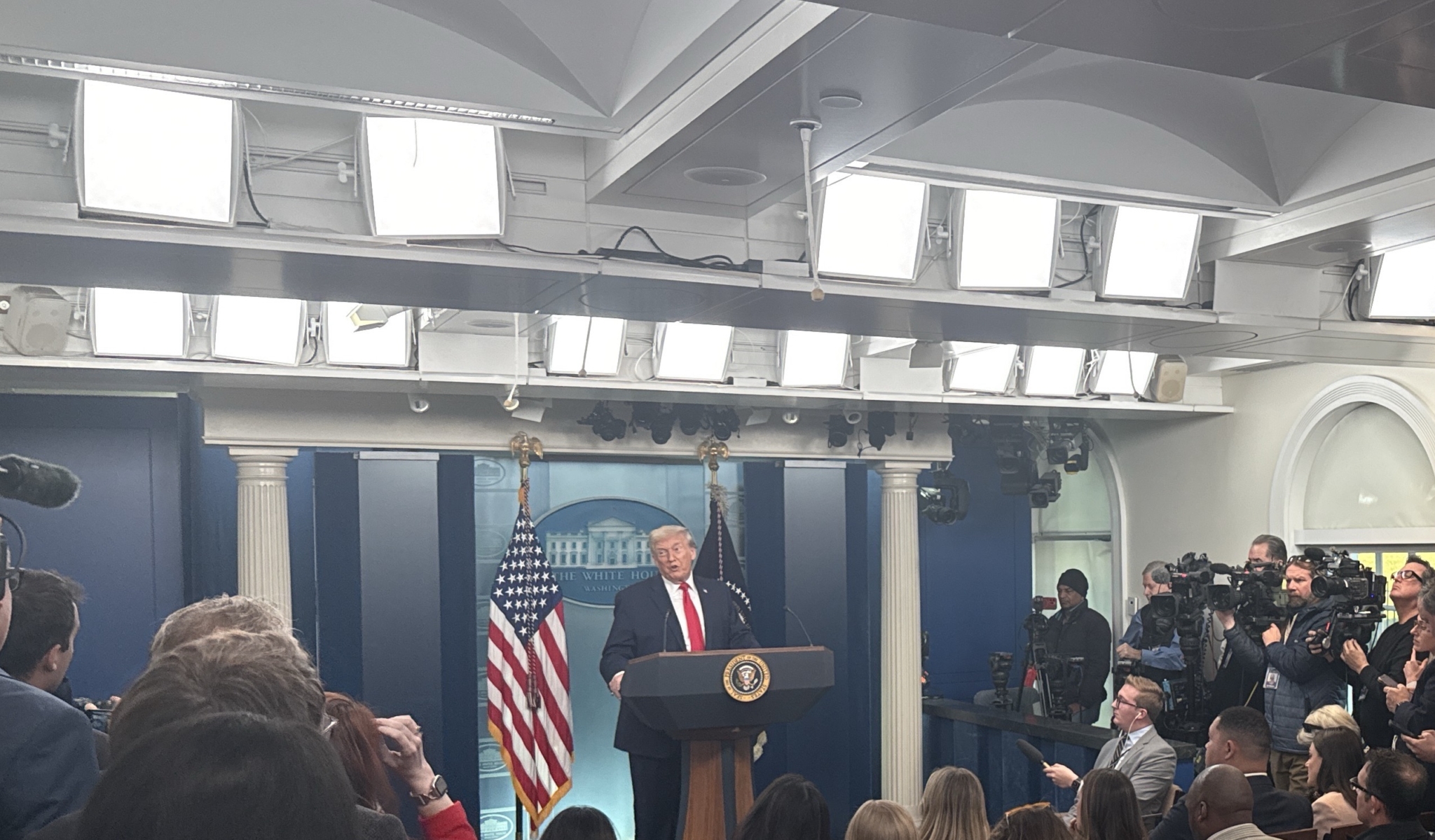 Thứ Ba (ngày 20/1) là tròn một năm kể từ khi Tổng thống Mỹ Donald Trump bước vào nhiệm kỳ thứ hai. Cùng ngày, ông tham dự buổi họp báo tại Nhà Trắng với tư cách là khách mời đặc biệt. Hình ảnh tại hiện trường buổi họp báo Nhà Trắng. (Nguồn ảnh: Jack Bradley / Epoch Times bản tiếng Anh)