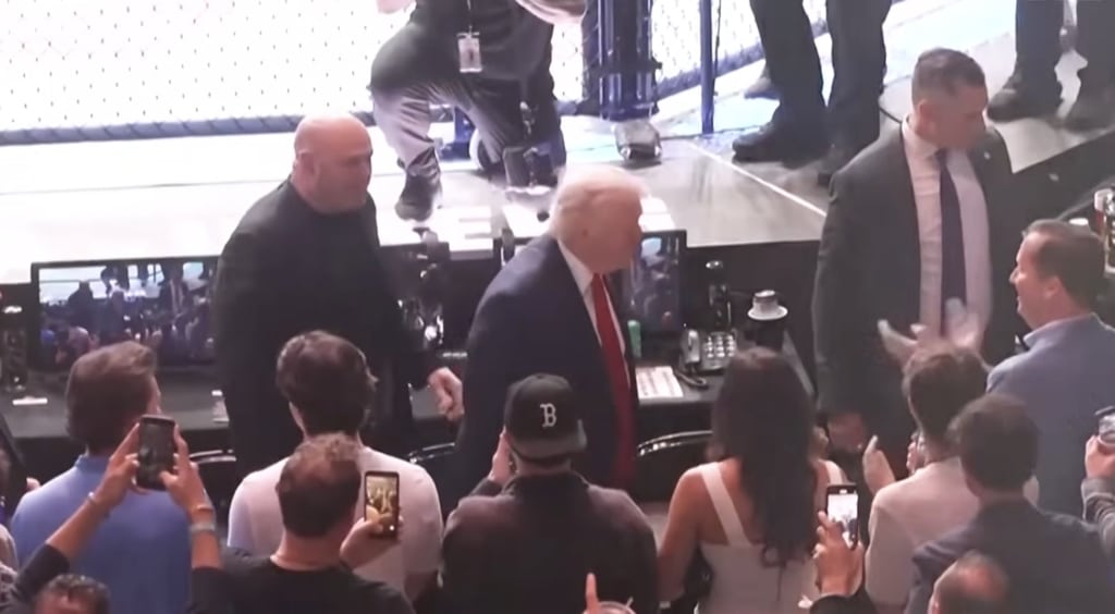 Sau 9 giờ tối, ông Trump bước vào Kaseya Center cùng Chủ tịch UFC Dana White và vài thành viên gia đình, để theo dõi trận tranh đai hạng bán nặng giữa Jiří Procházka và Carlos Ulberg. Trong tiếng nhạc rock vang dội, ông đi tới chỗ ngồi, nơi Ngoại trưởng Marco Rubio đã đợi sẵn; Đại sứ Mỹ tại Ấn Độ Sergio Gor cũng có mặt gần đó. Trên đường đi, ông Trump bắt tay khán giả quanh lồng đấu và đặc biệt dừng lại chào Joe Rogan. Trước ống kính, ông nhiều lần nở nụ cười và vẫy tay với đám đông.