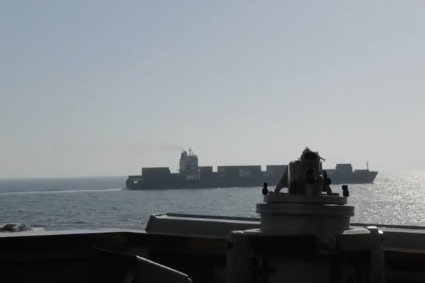 Ngày 19/4/2026, Hải quân Hoa Kỳ đã chặn bắt tàu chở hàng "Touska" mang cờ Iran. (Ảnh chụp màn hình từ video của Bộ Chỉ huy Trung ương Hoa Kỳ)