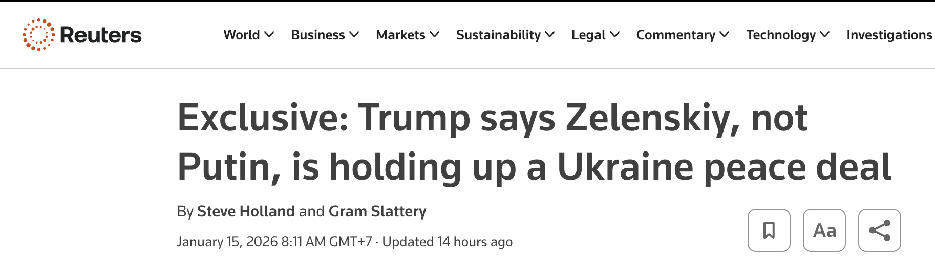 Khi được hỏi vào hôm thứ Tư (14/1) rằng bên nào đang làm chậm tiến trình đàm phán, ông Trump trả lời ngắn gọn bằng một cái tên: “Zelensky”.