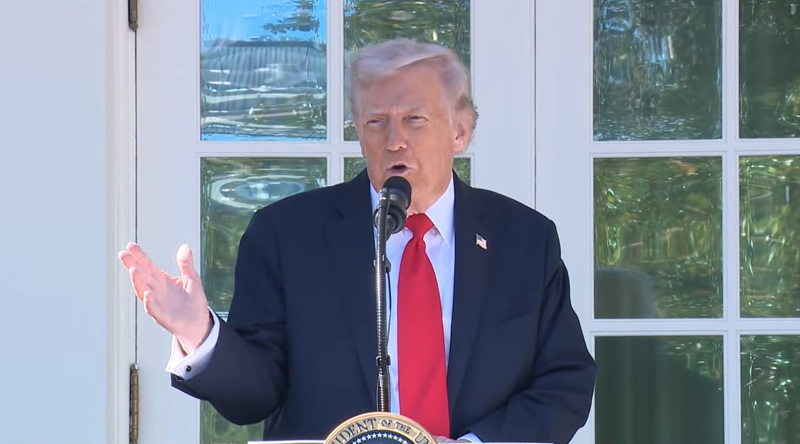Ngày 21/10/2025, Tổng thống Mỹ Donald Trump phát biểu tại buổi tiệc trưa tổ chức ở Vườn Hồng của Nhà Trắng. Khi chính phủ liên bang bước sang ngày thứ 21 bị tê liệt (đóng cửa), Tổng thống Trump đã tổ chức buổi tiệc trưa với các thượng nghị sĩ Đảng Cộng hòa. (Ảnh cắt từ video trên kênh YouTube Nhà Trắng)