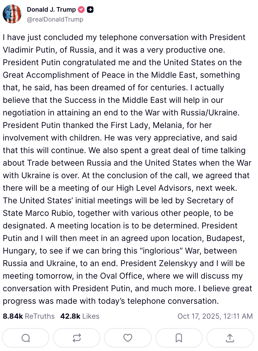 “Tôi vừa kết thúc cuộc điện đàm với Tổng thống Vladimir Putin của Nga, và đó là một cuộc trò chuyện rất hiệu quả. Tổng thống Putin đã chúc mừng tôi và Hoa Kỳ về Thành Tựu Vĩ Đại vì Hòa Bình ở Trung Đông, điều mà, theo ông, đã là giấc mơ suốt hàng thế kỷ. Tôi thực sự tin rằng Thành công ở Trung Đông sẽ giúp ích cho các cuộc đàm phán của chúng tôi nhằm chấm dứt Cuộc Chiến giữa Nga và Ukraine. Tổng thống Putin đã cảm ơn Đệ nhất Phu nhân, Melania, vì sự quan tâm của bà đối với trẻ em. Ông ấy rất trân trọng điều này, và nói rằng nó sẽ tiếp tục.