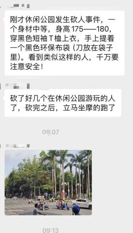 Trong một bức ảnh chụp màn hình cuộc trò chuyện, cư dân mạng viết: “Vừa rồi ở công viên giải trí xảy ra vụ chém người. Hung thủ là người thân hình cao khoảng 1m7 – 1m8, mặc áo thun ngắn tay màu đen, tay xách một túi vải đen thân thiện với môi trường (dao để trong túi). Nếu thấy người giống như vậy, mọi người cần hết sức chú ý an toàn! Hung thủ đã chém nhiều người đang vui chơi ở công viên giải trí, sau đó lập tức lên xe máy chạy mất”.