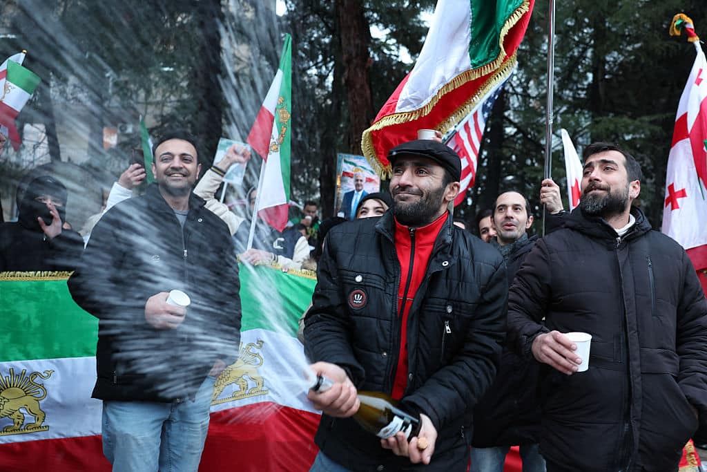 Ngày 28/2/2026, sau các cuộc không kích của Mỹ và Israel nhằm vào Iran, một số người Iran sống ở nước ngoài đã tổ chức ăn mừng trước Đại sứ quán Iran tại Tbilisi, thủ đô của Georgia. (Ảnh: Giorgi Arjevanidze/AFP qua Getty Images)