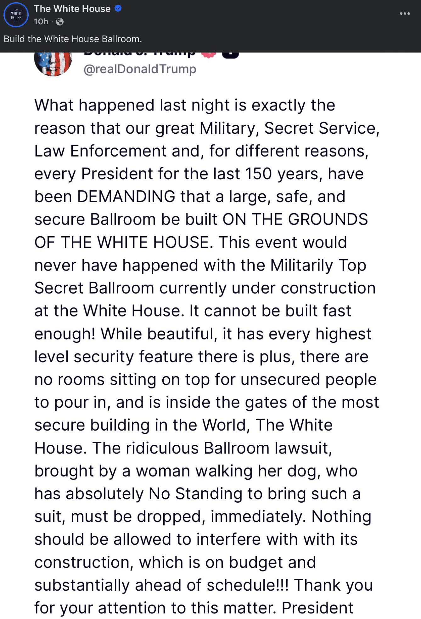 Ông viết: “Những gì xảy ra tối qua chính là lý do vì sao quân đội vĩ đại của chúng ta, Mật vụ, các lực lượng thực thi pháp luật, và các đời tổng thống trong 150 năm qua vì nhiều lý do khác nhau, luôn yêu cầu xây dựng một phòng yến tiệc lớn và an toàn ngay trong Nhà Trắng”.