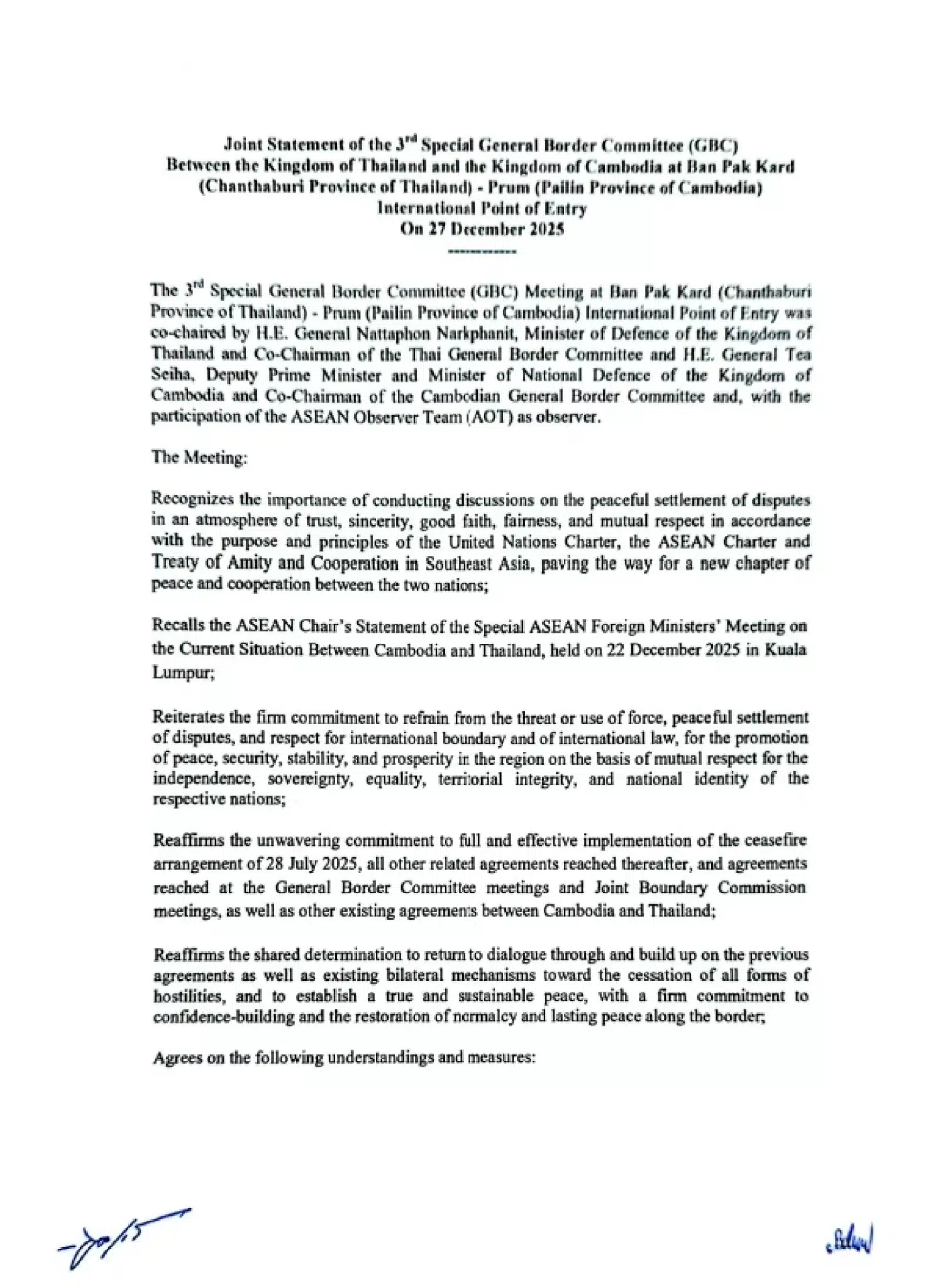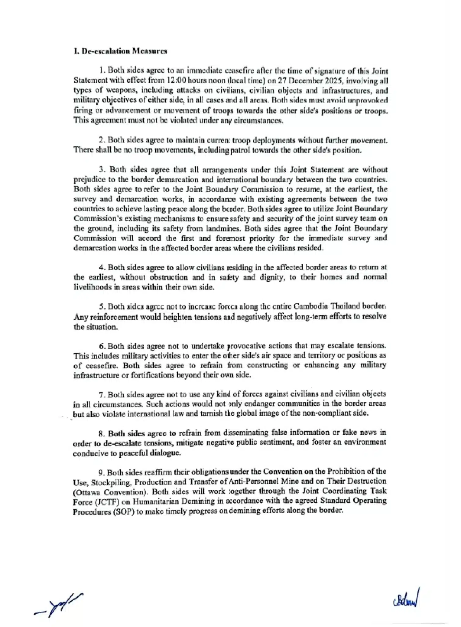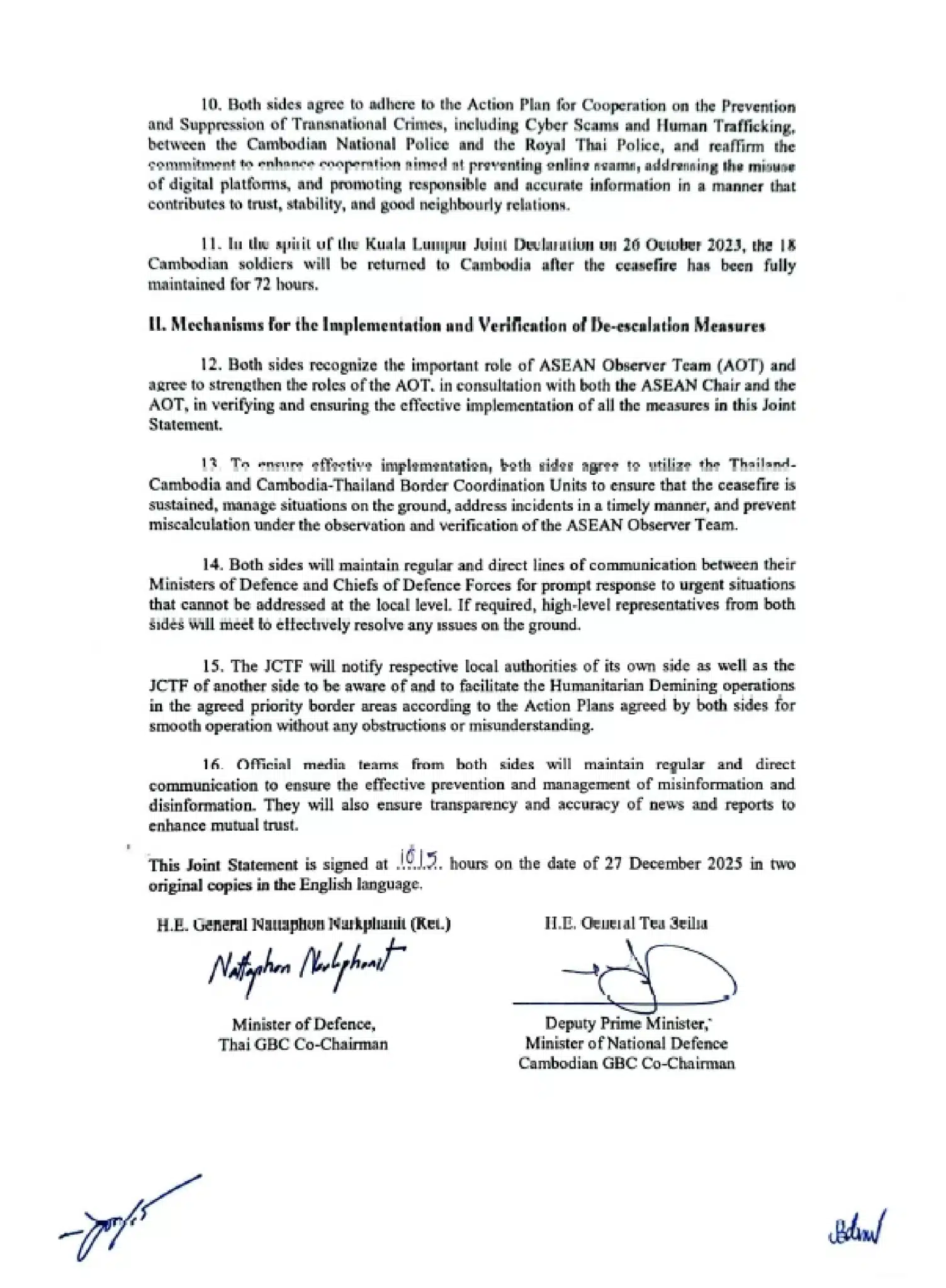 Thỏa thuận có hiệu lực từ 5h sáng theo giờ GMT (tức 12h trưa theo giờ địa phương), được Bộ trưởng Quốc phòng Thái Lan Natthaphon Narkphanit và Bộ trưởng Quốc phòng Campuchia Tea Seiha cùng ký tại một trạm kiểm soát biên giới, đánh dấu sự hạ nhiệt tạm thời của tình hình khu vực.