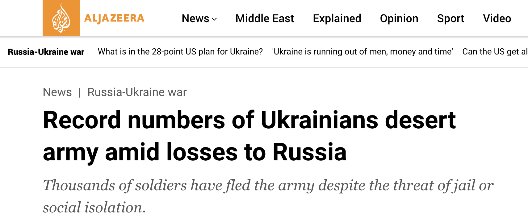 Phóng sự của Al Jazeera với nhân viên văn phòng Tymofey (36 tuổi) ở Kiev, tiết lộ các nguyên nhân sâu xa của làn sóng đào ngũ. Trên tay Tymofey vẫn còn vết sẹo màu tím nhạt để lại khi trèo qua hàng rào thép gai của trung tâm huấn luyện — lời chứng cho thấy hệ thống huấn luyện quân sự Ukraine đang gặp vấn đề nghiêm trọng.