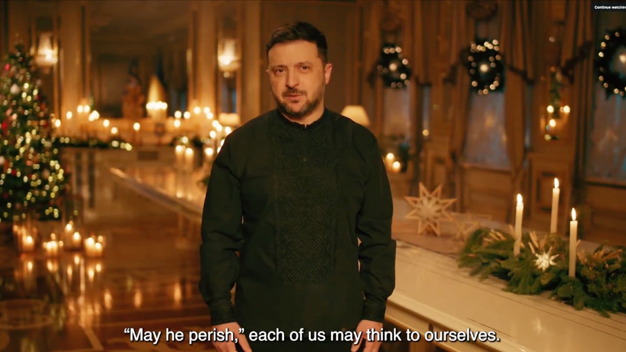 Tổng thống Ukraine Volodymyr Zelensky đã sử dụng bài phát biểu vào đêm Giáng Sinh của mình để cầu nguyện cho một người đàn ông không nêu tên “chết đi”. (Ảnh chụp màn hình video)