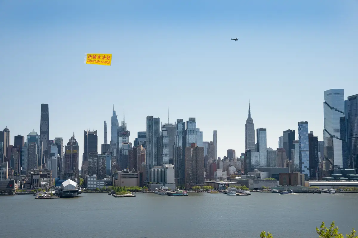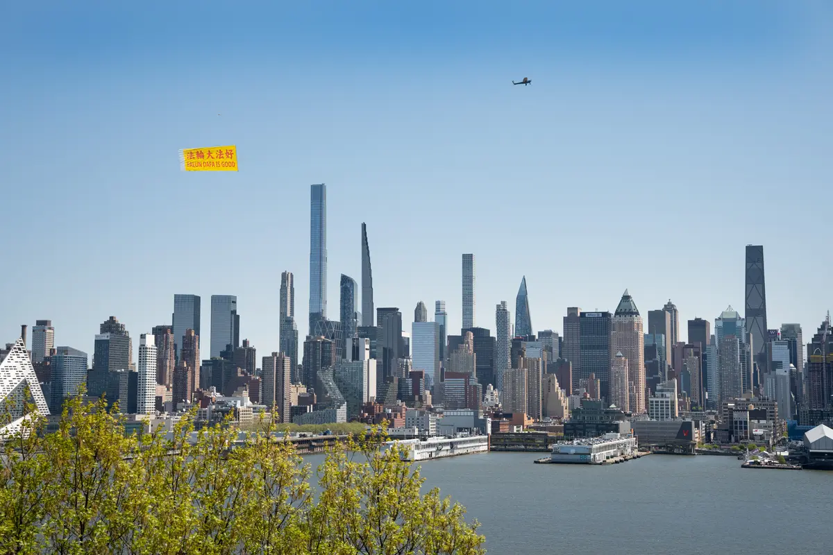 Vào thứ Sáu (24/4), trước thềm kỷ niệm 27 năm sự kiện thỉnh nguyện ôn hòa quy mô lớn “25/4” của các học viên Pháp Luân Công tại Trung Quốc, một máy bay cỡ nhỏ đã kéo theo một biểu ngữ khổng lồ với dòng chữ “Pháp Luân Đại Pháp hảo” (FALUN DAFA IS GOOD) trên bầu trời sông Hudson ở New York, nổi bật trên đường chân trời của “thành phố thế giới” New York.