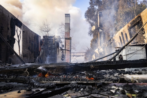 Vào ngày 8 tháng 1 năm 2025, lính cứu hỏa đã chiến đấu để dập tắt đám cháy Palisades gần Los Angeles, California, để lại một vùng đất hoang tàn rộng lớn. (John Fredricks/The Epoch Times)