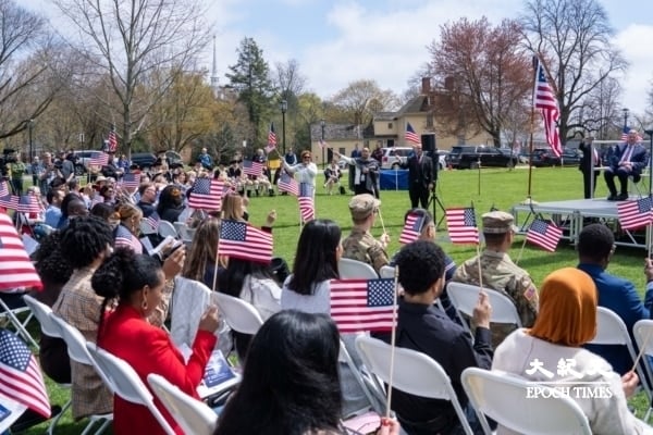 Theo một nguồn tin am hiểu tiết lộ với NBC News, Bộ Tư pháp Mỹ đang lên kế hoạch điều tra ít nhất 300 công dân Mỹ sinh ra ở nước ngoài và có thể tước quốc tịch của họ. Đây là một phần trong chiến dịch hủy bỏ nhập tịch dưới thời Tổng thống Donald Trump.Ngày 22/4/2025, tại địa điểm lịch sử của trận chiến đầu tiên trong Chiến tranh giành độc lập của Mỹ đã tổ chức lễ nhập tịch cho các công dân mới. Các khách mời cùng nhau chúc mừng sự kiện nhập tịch này. (Ảnh: Trương Bội Nhi /The Epoch Times)