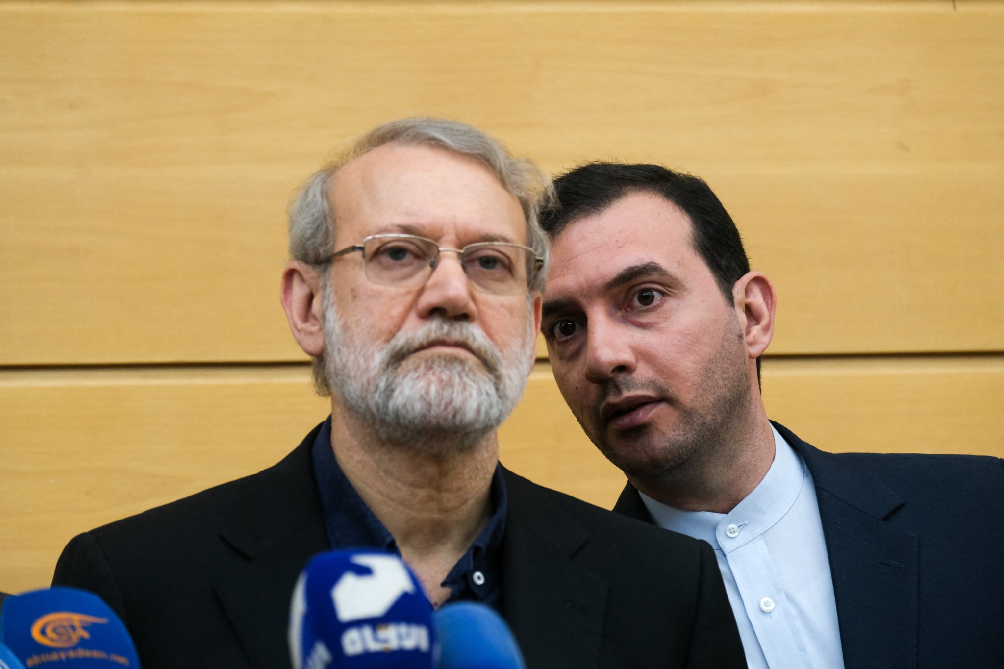 Vào ngày 27/9/2025, Bí thư Hội đồng An ninh Quốc gia Tối cao Iran Larijani (bên trái) tham dự lễ tưởng niệm lãnh đạo Hezbollah Hassan Nasrallah tại Beirut, Lebanon. Ông Larijani đã thiệt mạng trong một cuộc không kích của Israel vào ngày 16/3/2026. (Ảnh: Courtney Bonneau/Middle East Images/AFP via Getty Images)