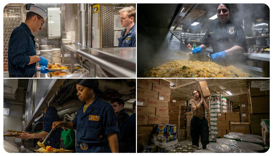 Thủy thủ đoàn trên tàu USS Abraham Lincoln và USS Tripoli tiếp tục được phục vụ các bữa ăn được chuẩn bị thường xuyên trên biển—không gián đoạn, không thiếu thốn. (Ảnh chụp màn hình X của Hải quân Hoa Kỳ)