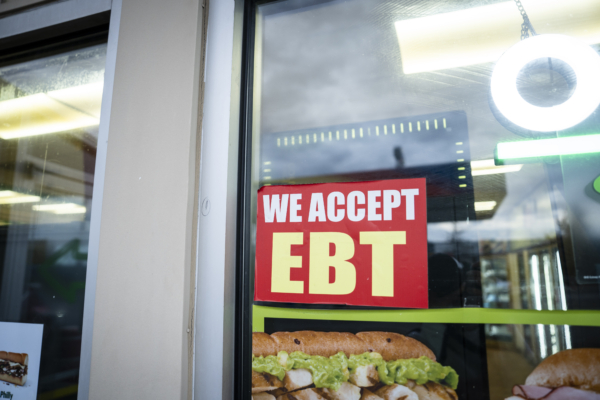 Ngày 5/11/2025, biểu tượng chấp nhận thẻ phúc lợi điện tử (EBT) được treo trên cửa sổ một trạm xăng tại thành phố Hazleton, bang Pennsylvania. (Ảnh: Madalina Kilroy/Epoch Times)