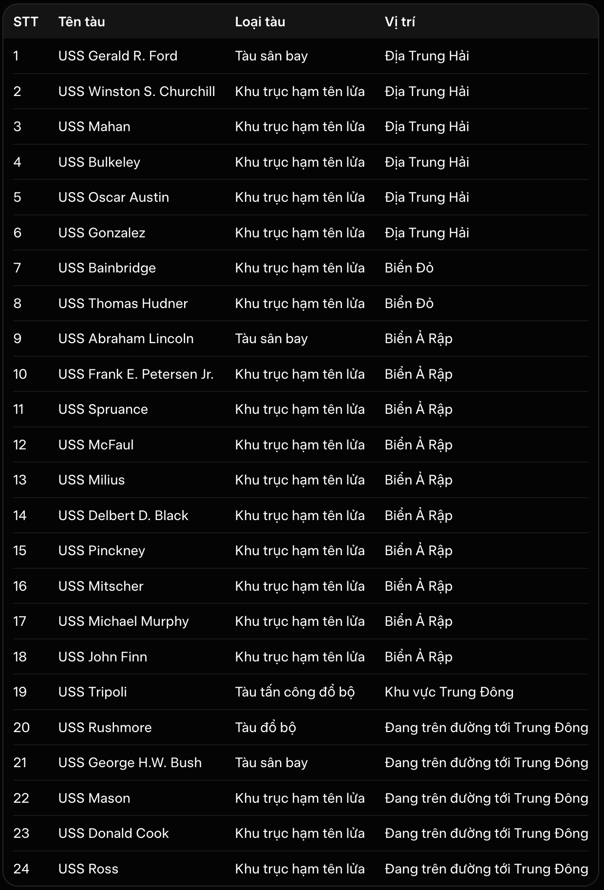 Dưới đây là bảng tổng hợp các lực lượng chủ yếu của Mỹ triển khai trong khu vực, dựa trên dữ liệu của Viện Hải quân Mỹ (USNI) tính đến ngày 6/4: