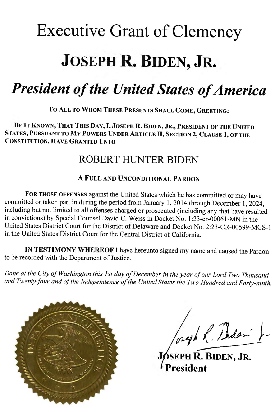 Năm ngoái, cựu Tổng thống Biden ký lệnh ân xá cho các hành vi mà Hunter Biden “đã phạm hoặc có thể đã phạm” từ ngày 1/1/2014 đến 1/12/2024.