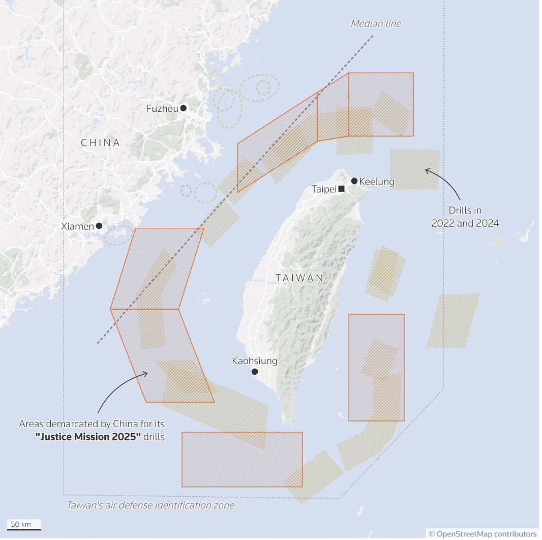 Được đặt tên là “Sứ mệnh Chính nghĩa 2025”, các cuộc diễn tập bắt đầu 11 ngày sau khi Mỹ công bố gói bán vũ khí kỷ lục trị giá 11,1 tỷ USD cho Đài Loan, động thái làm dấy lên sự phẫn nộ của Bộ Quốc phòng Trung Quốc cùng các cảnh báo rằng quân đội sẽ “thực hiện các biện pháp mạnh mẽ” để đáp trả.