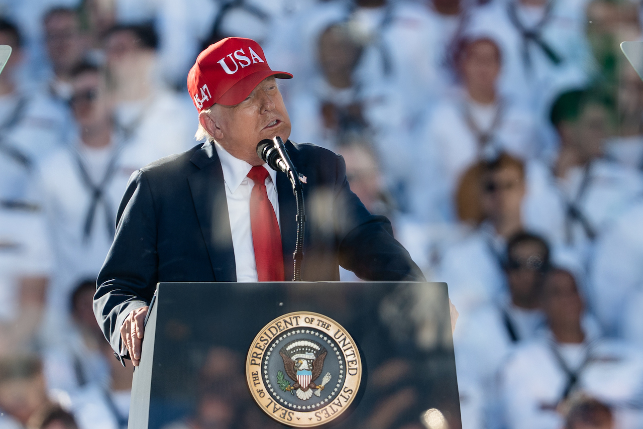 Ngày 5/10, Tổng thống Trump phát biểu trên tàu sân bay USS Harry S. Truman trong lễ kỷ niệm 250 năm Hải quân Hoa Kỳ. (Ảnh: Madalina Kilroy/Epoch Times)