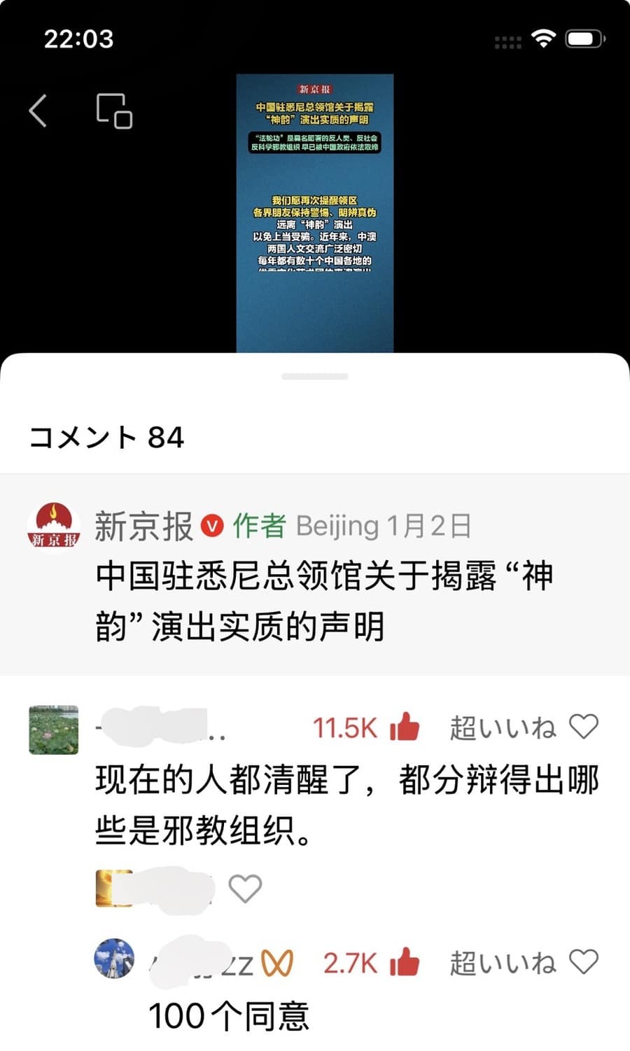 Ngày 2/1/2026, một sự kiện tin tức tưởng như bình thường lại bất ngờ xé toang tấm màn che kiểm soát dư luận của ĐCSTQ, để lộ xu hướng thực sự của lòng dân. Nguyên nhân bắt đầu từ một thông tin do tờ “Tân Kinh Báo”, cơ quan ngôn luận của ĐCSTQ, đăng tải trên tài khoản video của mình. Nội dung là tuyên bố của Tổng lãnh sự quán ĐCSTQ tại Sydney công kích “biểu diễn Thần Vận”.