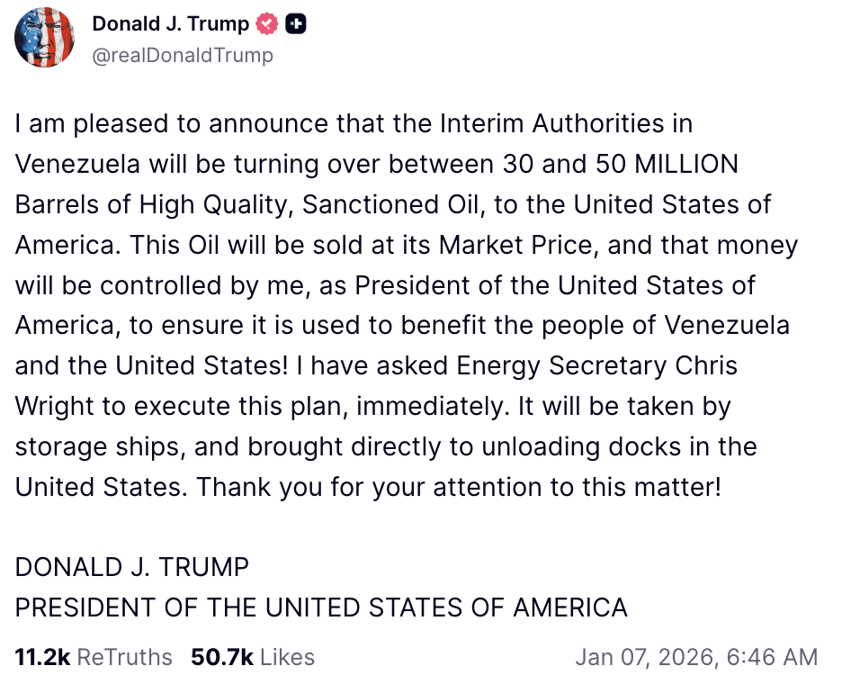Ông Trump đăng trên nền tảng mạng xã hội “Truth Social” do ông sở hữu: “Tôi rất vui mừng thông báo rằng chính quyền lâm thời Venezuela sẽ chuyển giao cho Hợp chúng quốc Hoa Kỳ từ 30 triệu đến 50 triệu thùng dầu mỏ chất lượng cao bị trừng phạt”.