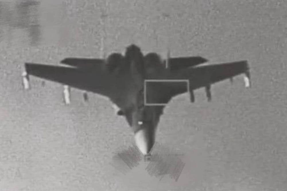 Bức ảnh đen trắng do tiêm kích F‑16V của Không quân Đài Loan chụp lại, cho thấy rõ chiến cơ J‑16 của PLA đang bay trong vùng tập trận; thiết bị thực hiện việc này là pod ngắm AN/AAQ‑33 Sniper Advanced Targeting Pod do Lockheed Martin chế tạo.