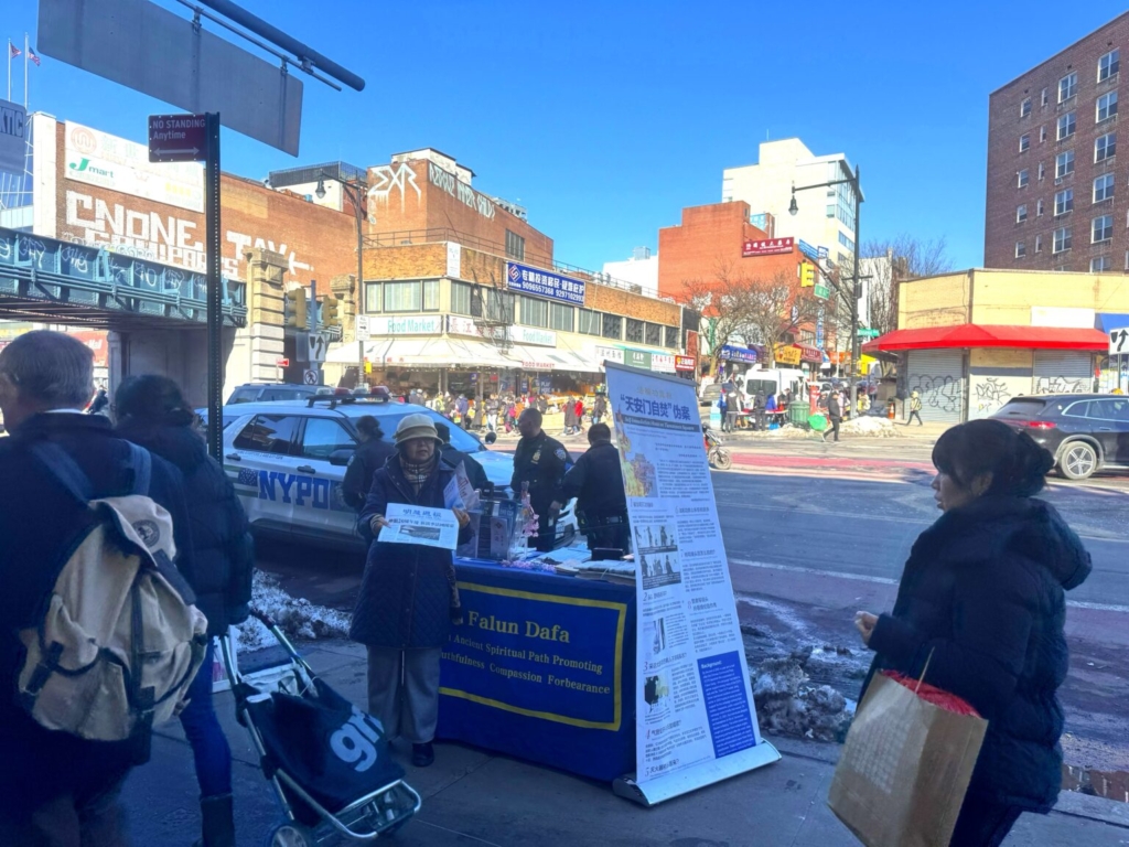 Lúc 1h13 chiều ngày 27/2/2026, tại Phố Main (Main St.) ở Flushing, New York, một tên côn đồ đã công khai tấn công một tình nguyện viên tại địa điểm nói rõ sự thật về cuộc đàn áp và dịch vụ thoái đảng của Pháp Luân Công.