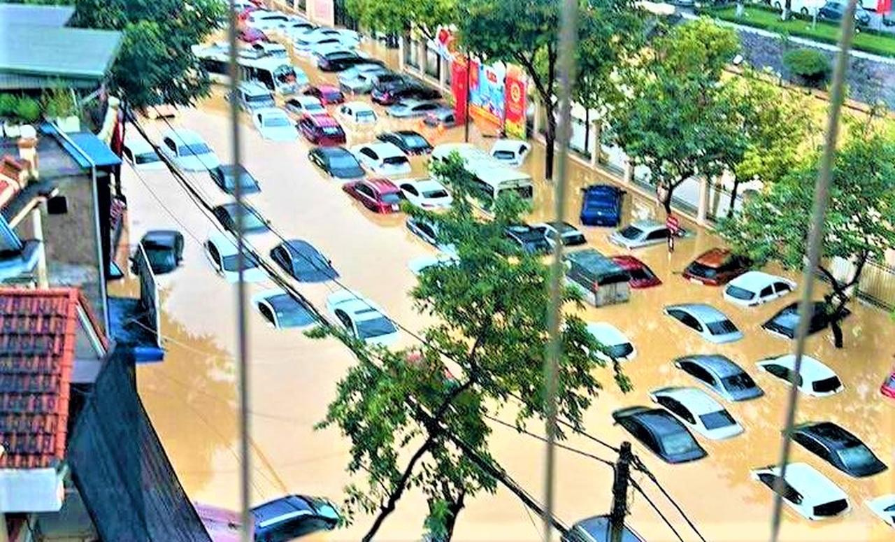 Nhiều ô tô chìm trong biển nước ở Thái Nguyên. (Ảnh: Thái Nguyên News/Facebook)