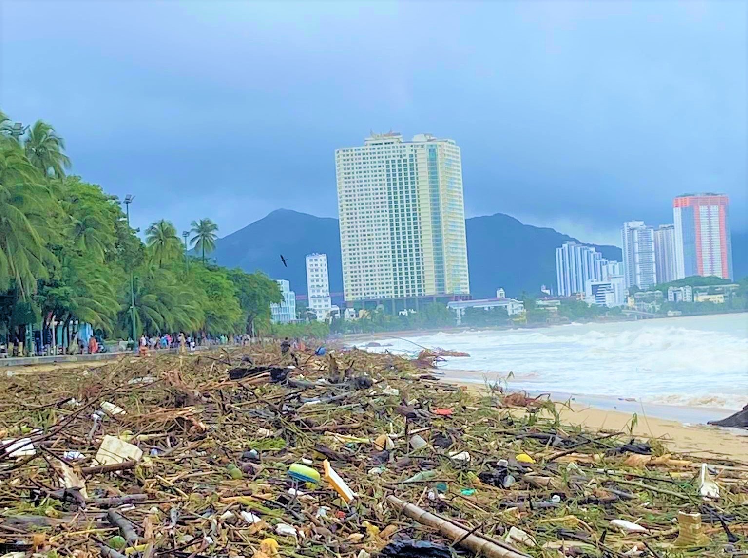 Bãi biển Nha Trang tan hoang sau mưa lũ. (Ảnh: Facebook)