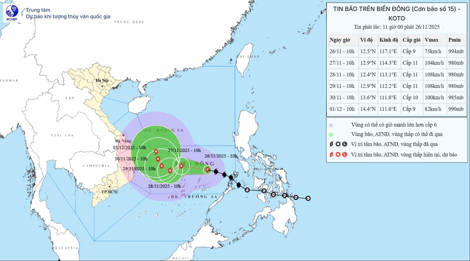 Theo Trung tâm Dự báo Khí tượng Thủy văn Quốc gia, hồi 10h ngày 26/11, vị trí tâm bão ở vào khoảng 12,5 độ Vĩ Bắc; 117,1 độ Kinh Đông, cách đảo Song Tử Tây khoảng 330km về phía Đông Đông Bắc. Sức gió mạnh nhất vùng gần tâm bão mạnh cấp 8-9 (62-88km/giờ), giật cấp 11. Di chuyển theo hướng Tây Tây Bắc với tốc độ 20-25km/h.