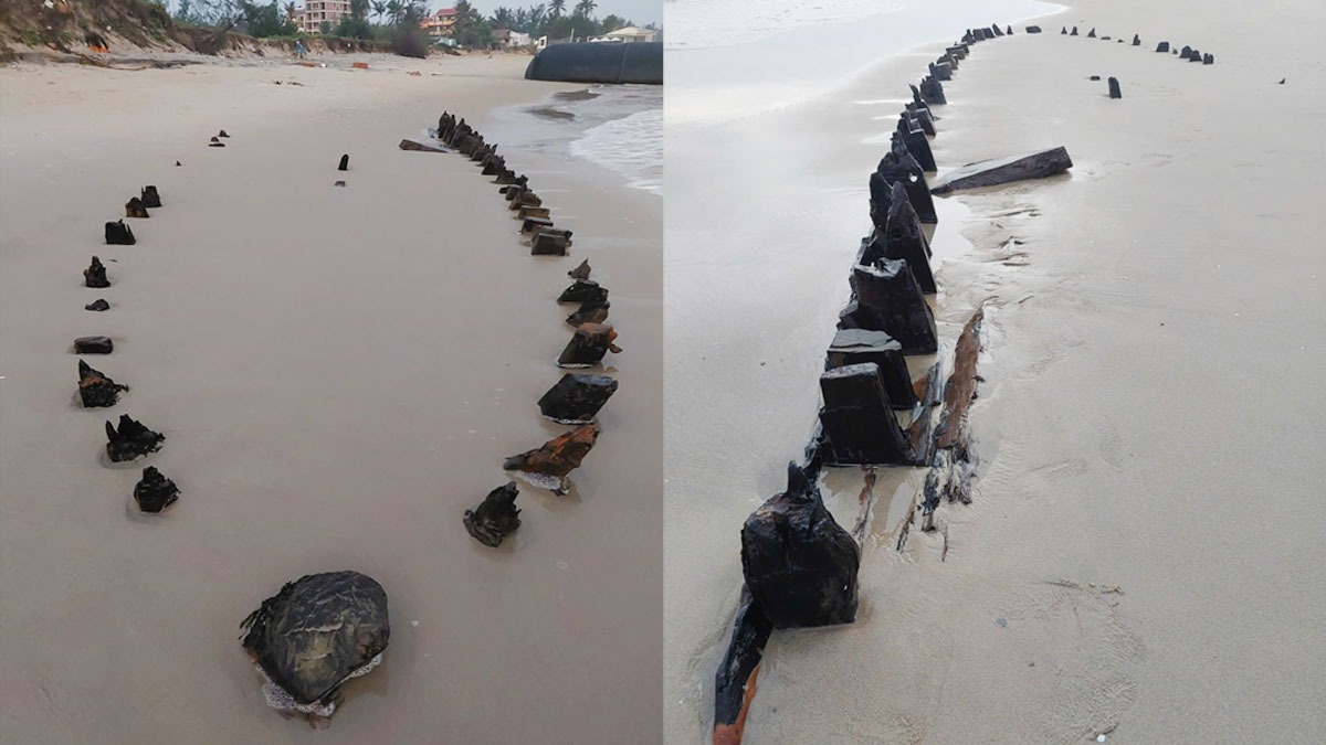 Cơn bão số 13 mang tên Kalmaegi đã gây ra sóng lớn và tình trạng sạt lở nghiêm trọng dọc bờ biển. Những đợt sóng dữ đã cuốn trôi lớp cát phủ kín, khiến con tàu hiện rõ trước mắt.