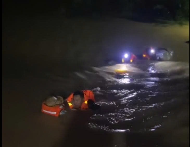 Công an xã Tuy Phước bơi giữa dòng nước lụt giải cứu người dân bị ngập nhà trong đêm (Ảnh: Công an xã Tuy Phước)