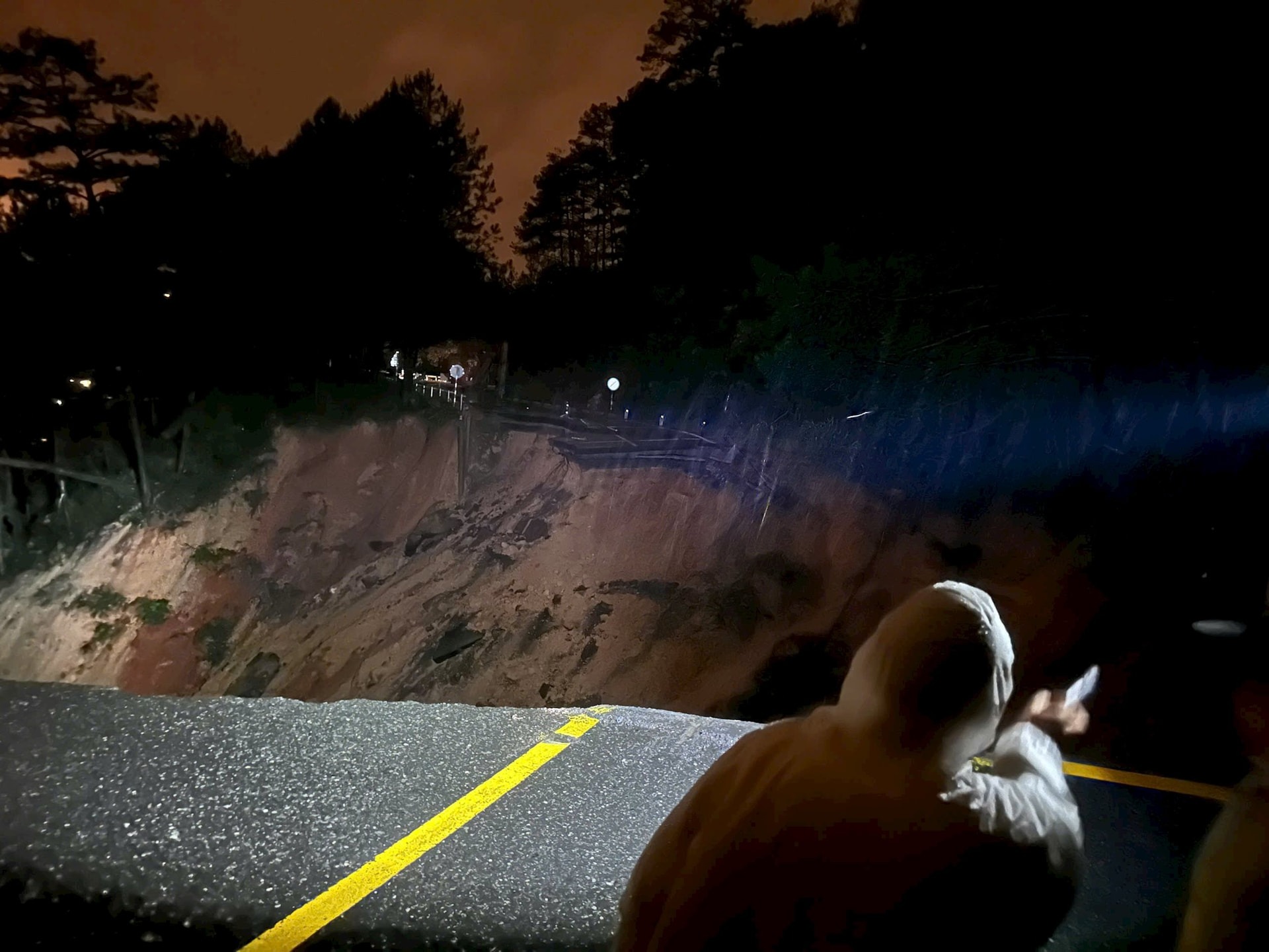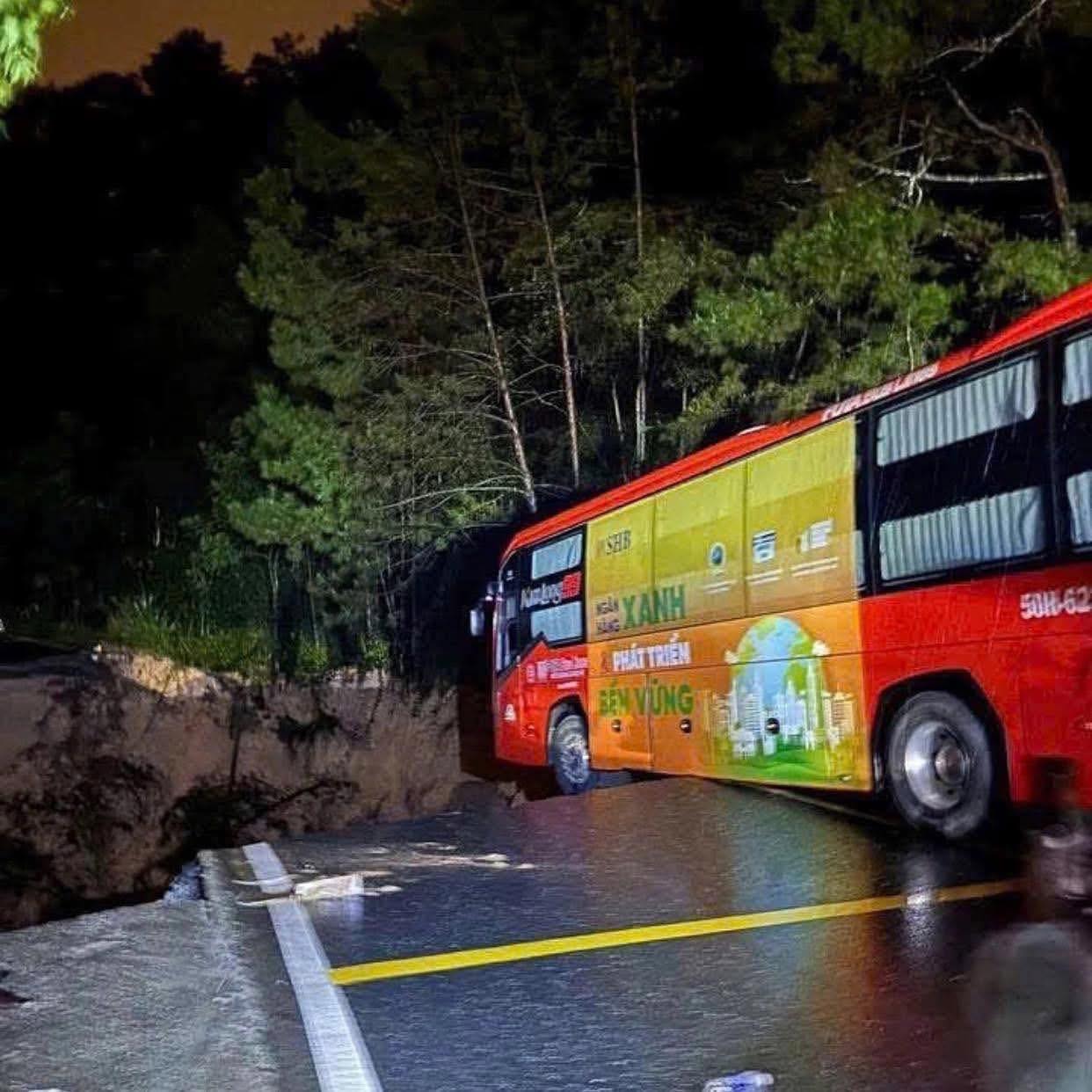 Sạt lở tại Km 226+500 đèo Mimosa khiến mặt đường đứt gãy sâu 30 m, một xe khách suýt rơi xuống vực. Lực lượng chức năng đã di dời 12 người dân tới nơi an toàn.