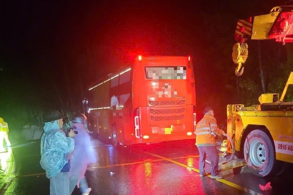 Tại thời điểm xảy ra, một xe khách loại 45 chỗ của Công ty Phương Trang chạy qua khu vực thì bánh trước sụp xuống mép hố, nằm chênh vênh sát vực.