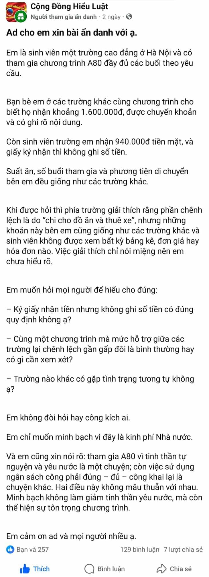 Nhà trường xin số tài khoản nhưng cuối cùng gọi sinh viên lên nhận tiền mặt. N.M.T. phát hiện một sinh viên tình nguyện làm nhiệm vụ quản sinh của trường được chuyển khoản 995.000 đồng tiền bồi dưỡng A80, kèm bằng khen và thêm 702.000 đồng tiền mặt. Việc mỗi sinh viên nhận khoản khác nhau khiến N.M.T. thấy chưa rõ ràng.