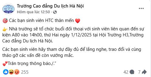 Trước các phản ánh, Trường Cao đẳng Du lịch Hà Nội đăng thông báo trên Facebook chính thức, cho biết sẽ tổ chức buổi đối thoại chiều 1/12 để tháo gỡ vướng mắc liên quan đến sự kiện A80.