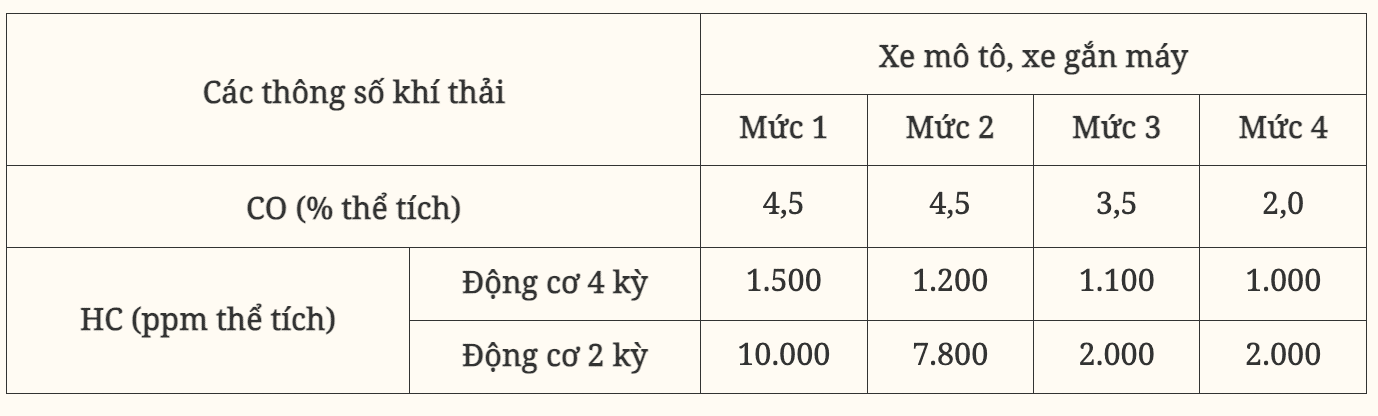 Trong đó, các mức giới hạn được xác định cụ thể theo từng loại động cơ và cấp độ khí thải, nhằm kiểm soát lượng khí phát thải từ phương tiện giao thông cá nhân.