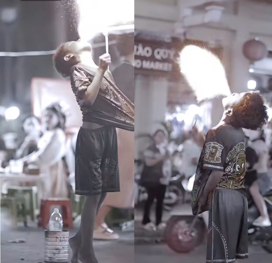 Một trong số những trẻ em bị Lượm - Trang “chăn dắt” đang ngậm dầu phun lửa đê xin tiền tại quán nhậu. (Ảnh: congan.cantho.gov.vn)