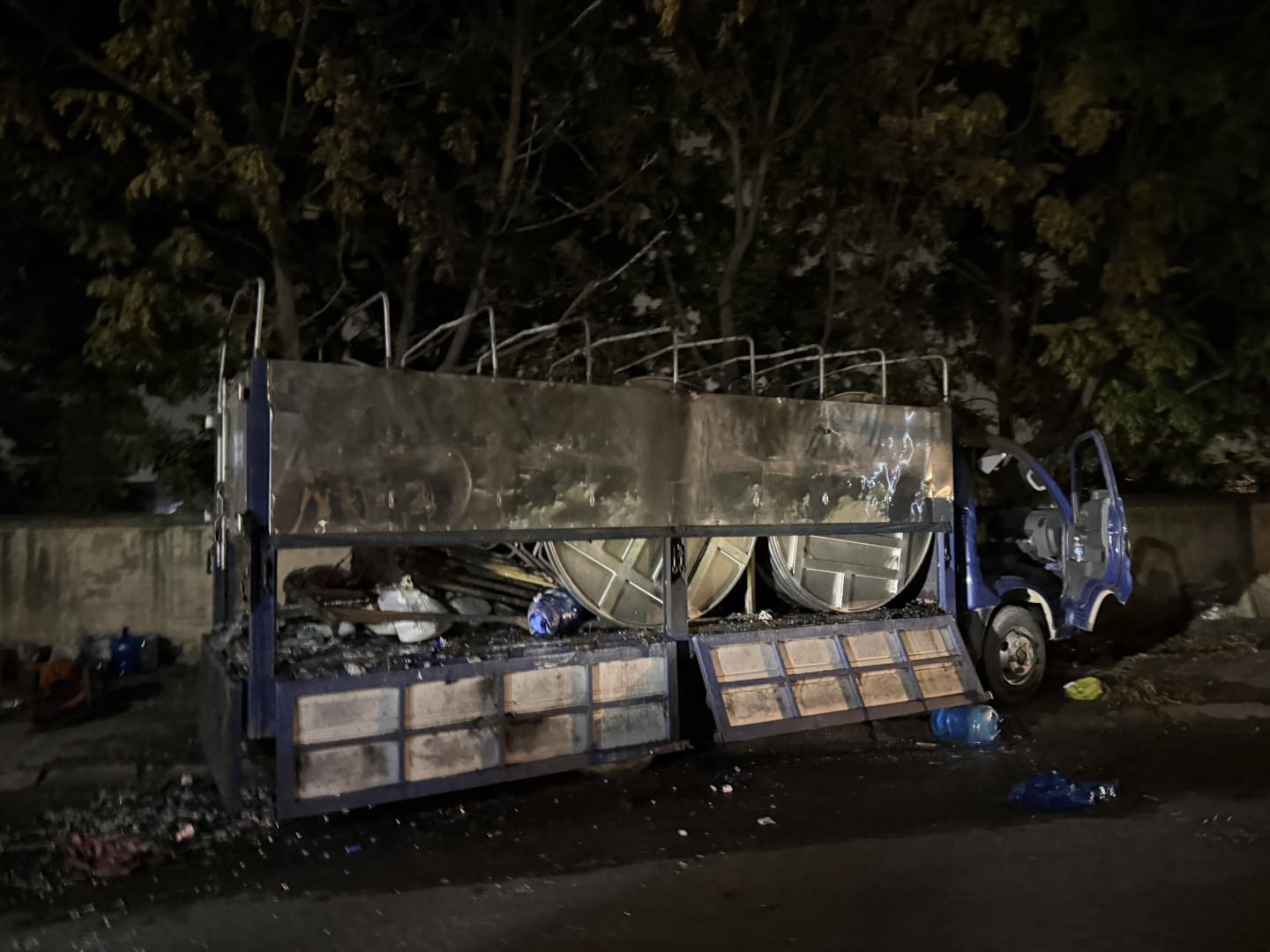 Ngọn lửa bùng lên cao, nhanh chóng thiêu rụi toàn bộ chiếc xe. Một xe ô tô tải chở bình nước uống đỗ bên vệ đường bị ảnh hưởng bởi vụ nổ, hư hỏng theo.