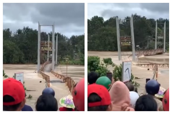 Hình ảnh cầu bị cuốn trôi ở Lâm Đồng. (Ảnh cắt từ clip/Facebook)