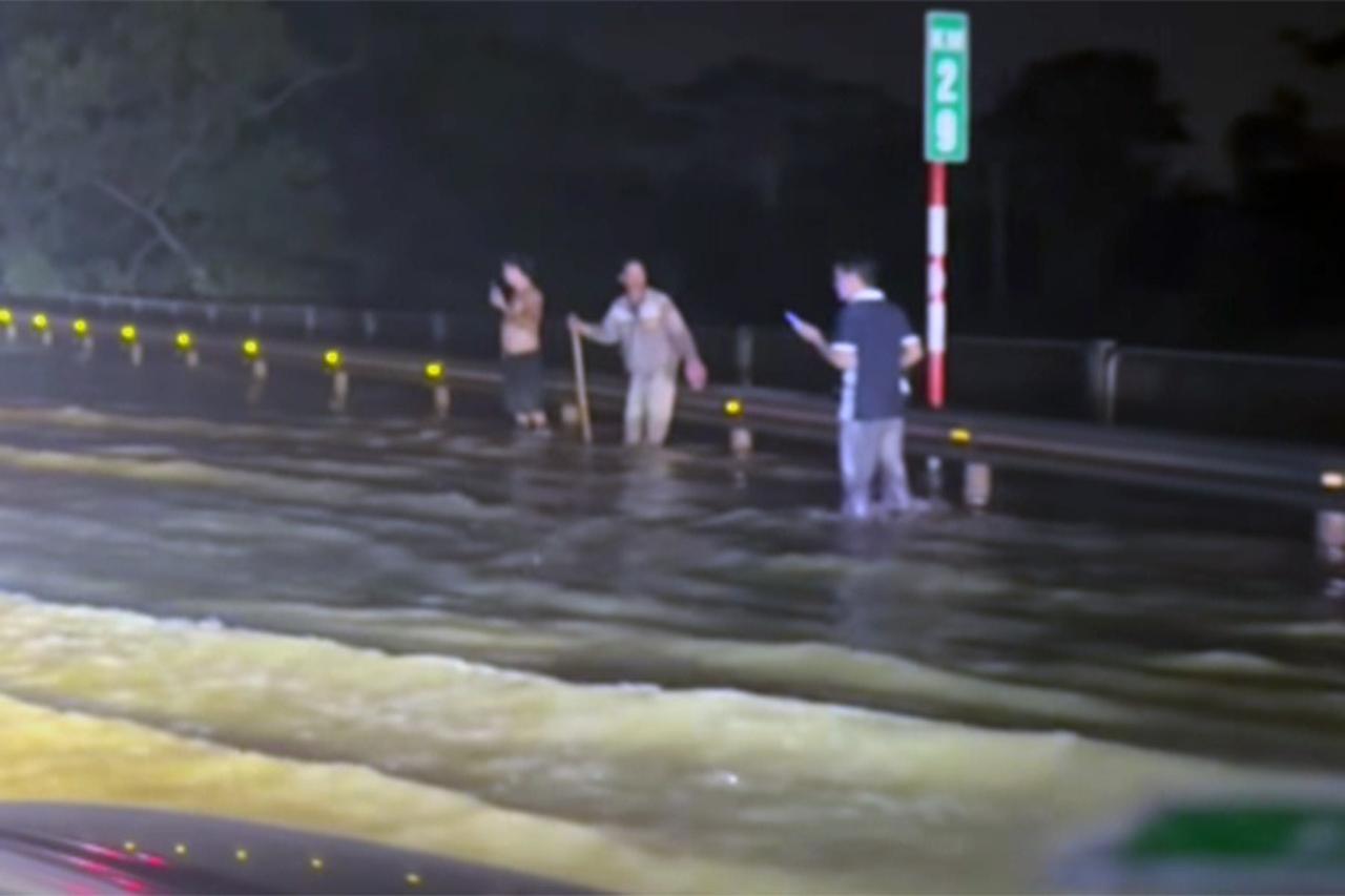Nước lũ tràn lên cao tốc Hà Nội - Thái Nguyên. (Ảnh cắt từ clip/Facebook)