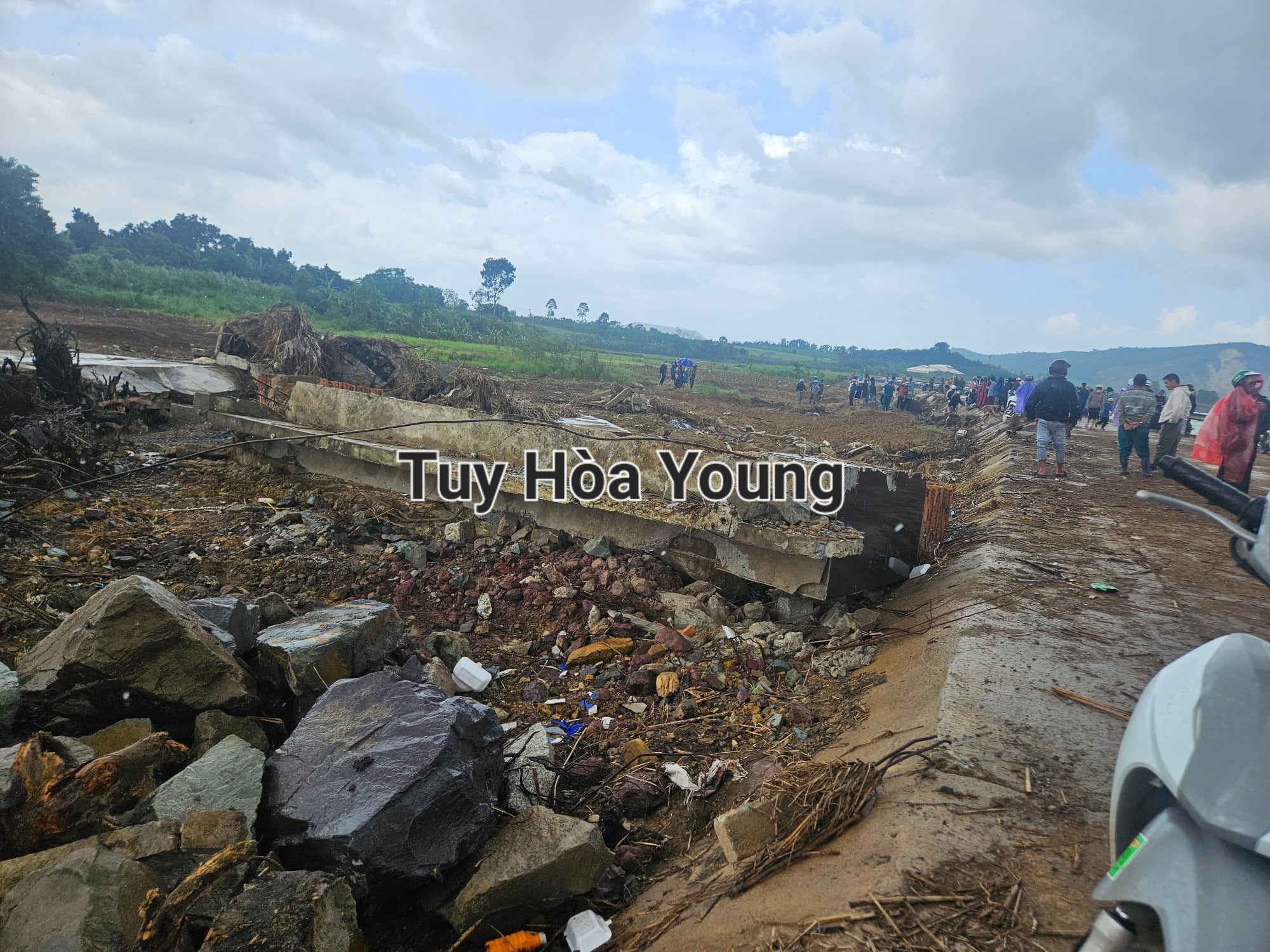 Bờ kè đoạn qua thôn Lạc Mỹ bị sạt lở nặng sau trận mưa lũ lịch sử tại Phú Yên cũ hồi tháng 11/2025. Phần bờ kè 4 nạn nhân vào trú mưa và gặp nạn là phần bị khoét sâu hàm ếch do nước lũ làm xói lở chân kè.