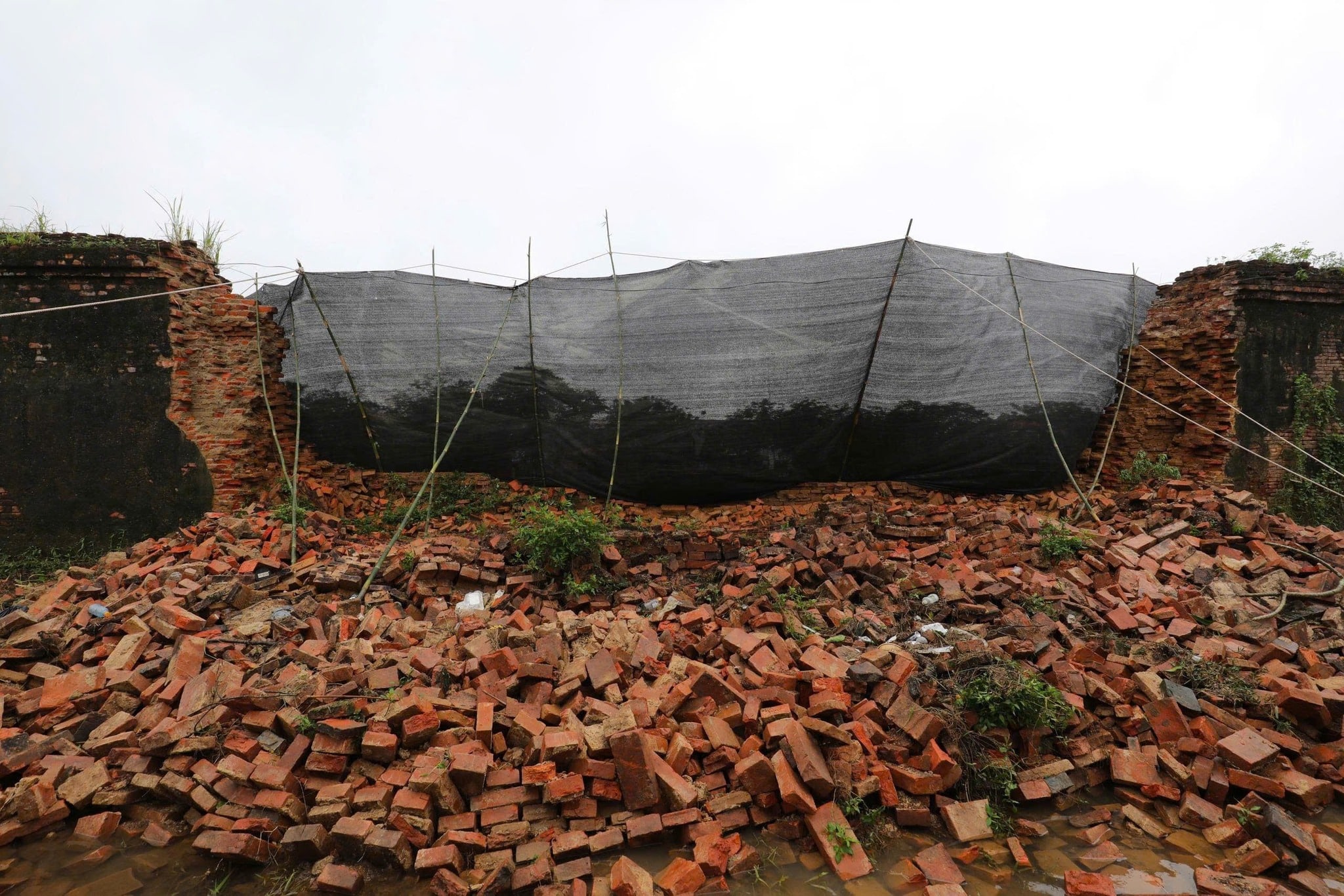 Phần tường Hoàng Thành Huế bị sập được bao che tạm, dưới chân vẫn còn ngập nước. (Ảnh: Trung tâm Bảo tồn Di tích Cố đô Huế/Facebook)